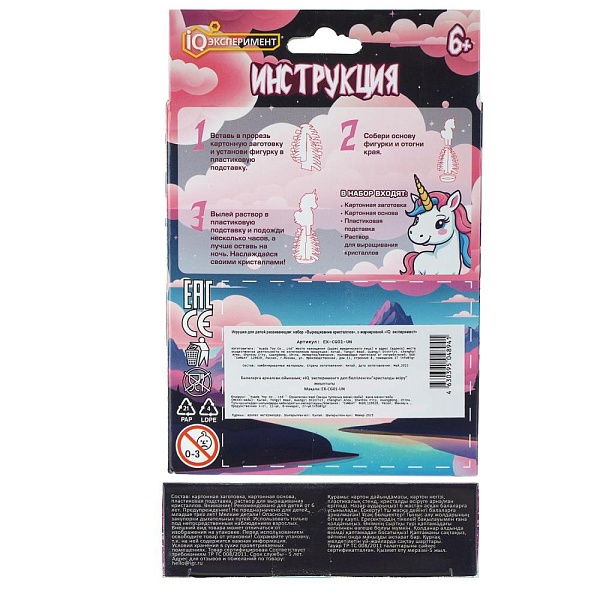 Набор для выращивания кристаллов — это увлекательный способ познакомиться с основами химии и физики, наблюдая за удивительным процессом кристаллизации. Из входящих в состав набора предметов нужно собрать фигурку и установить её в пластиковую подставку. Останется лишь вылить в подставку специальный раствор и подождать несколько часов: конструкция начнёт обрастать кристалликами, а через 24 часа закристаллизуется по максимуму, превратившись в волшебную инсталляцию, верхушку которой будет украшать картонная фигурка очаровательного единорожки.
