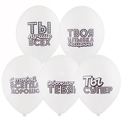 Белые шарики в голливудском стиле. Надписи: Обожаю Тебя! Ты лучше всех! С тобой всегда хорошо! Твоя улыбка бесценна! Ты супер! Надежда человечества! Размер шаров в надуве - 14 дюймов (36см). Шары подходят как для надува воздухом при помощи ручного насоса или компрессора, так и заполнения гелием. Рисунок вертикальный, поэтому при надуве воздухом рекомендуем ставить их на палочку и розетку. Шары продаются ненадутыми. Шары выполнены из натурального биоразлагаемого латекса, после употребления лопнуть и утилизировать как бытовой отход. В упаковке 5 шариков.