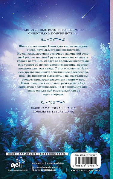Но однажды девушка замечает маленький зеленый росток на своей руке и начинает слышать голоса растений. Следуя за лесными шепотами, она узнает об исчезновении мальчика, произошедшем два года назад. С этого момента Наин и ее друзья начинают собственное расследование. Им придется выяснить, к каким голосам следует прислушиваться, а к каким — нет.