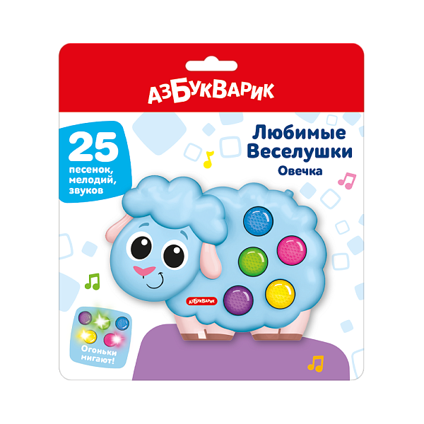Музыкальная овечка из серии «Любимые Веселушки» мило улыбается и замечательно поет! Нажимая на разноцветные кнопочки, малыш послушает веселые песенки и мелодии («Кудрявая овечка», «Каравай», «Калинка», «Серенький козлик», «Как у наших у ворот», «Во саду ли, в огороде», «Антошка» и др.), а также множество забавных звуков и голосов зверят. Всего в игрушке 25 песенок, мелодий, звуков. Во время звучания песенок на кнопочках мигают огоньки!