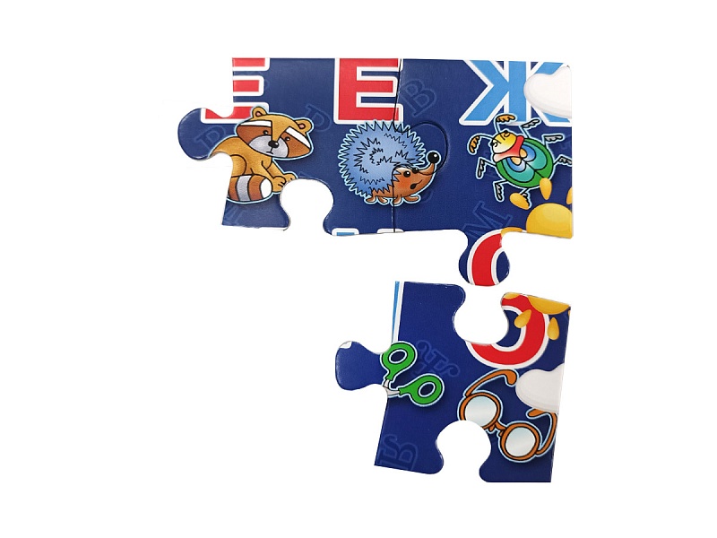На элементах пазла изображены буквы русского алфавита и предметы или животные, названия которых начинается на данную букву.