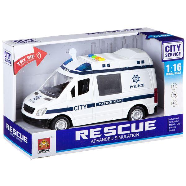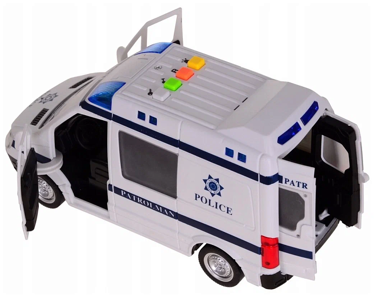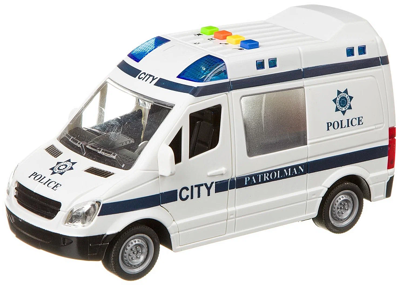 Игрушечная машина с инерционным механизмом движения "Полиция" выполнена в масштабе 1:16. В игрушке предусмотрены светозвуковые эффекты: свет мигалки и автомобильные звуки, которые активируются нажатием кнопок на крыше кузова. Передние двери можно открывать и закрывать вручную.