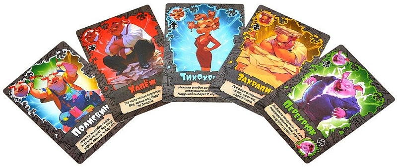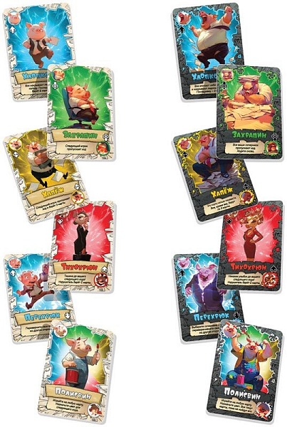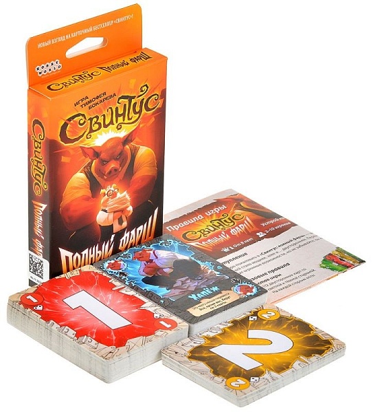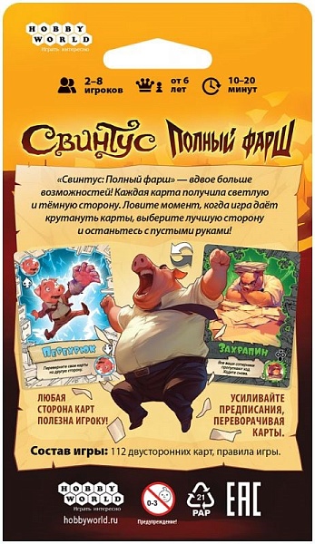 "Свинтус: Полный фарш" – вдвое больше возможностей! Каждая карта получила светлую и тёмную сторону. Ловите момент, когда игра даёт крутануть карты, выберите лучшую сторону и останьтесь с пустыми руками!