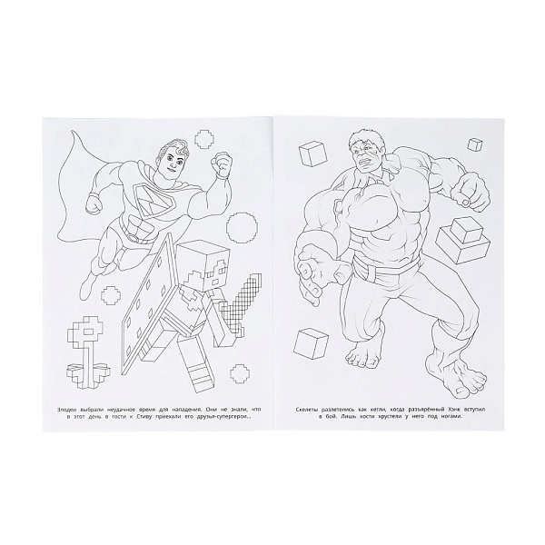 Эта занимательная раскраска про приключения отважного супергероя и персонажей виртуального квадратного мира не только скрасит досуг ребёнка, но и поможет ему потренировать руку к письму. Внутри детей ожидают интересные картинки с чётким контуром и сюжетные тексты к ним. Благодаря удобному формату раскраску можно взять с собой в дорогу.