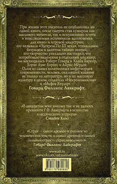 При жизни этот писатель не опубликовал ни одной книги, после смерти став кумиром как массового читателя, так и искушенного эстета, и неиссякаемым источником вдохновения для кино- и игровой индустрии; его называли «Эдгаром По ХХ века», гениальным безумцем и адептом тайных знаний; его творчество уникально настолько, что потребовало выделения в отдельный поджанр; им восхищались Роберт Говард и Клайв Баркер, Хорхе Луис Борхес и Айрис Мёрдок.