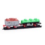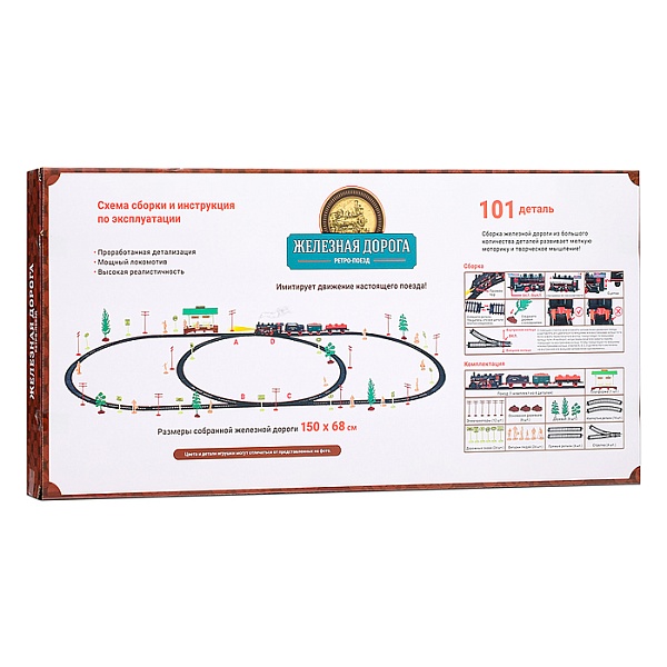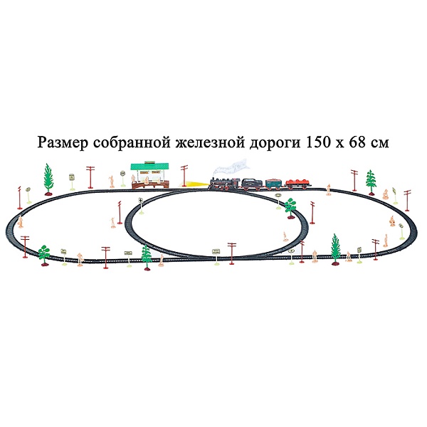В комплекте 101 деталь – локомотив, вагоны, платформа, изогнутые рельсы, прямые рельсы, стрелка, деревья, основания деревьев, электроопоры, дорожные знаки, фигурки людей.