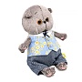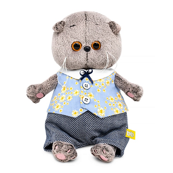 Малыш Басик в трогательном х/б жилетике нежно-голубого цвета с набивным рисунком. Жилетик сшит с отложным белым воротником, на пуговках спереди и украшен маленьким тёмно-синим бантиком. Также на Басике серо-черные штанишки из плотного трикотажа в ёлочку.