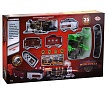 В комплекте: локомотив состав с углем, грузовой состав, пассажирский состав, сборные рельсы (12 прямых рельсов, 8 закругленных рельсов), 8 дорожных знаков, 2 дерева, пульт управления.